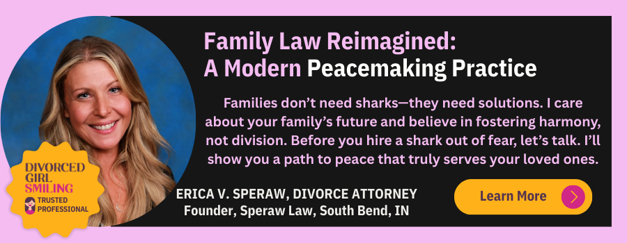 Erica Speraw calls herself a peacemaker. The South Bend, Indiana divorce attorney, who has been practicing divorce law since 2013 says peacemaking is the way to resolve divorce cases with wisdom and care. “Families don’t need sharks-they need solutions,” Speraw says.